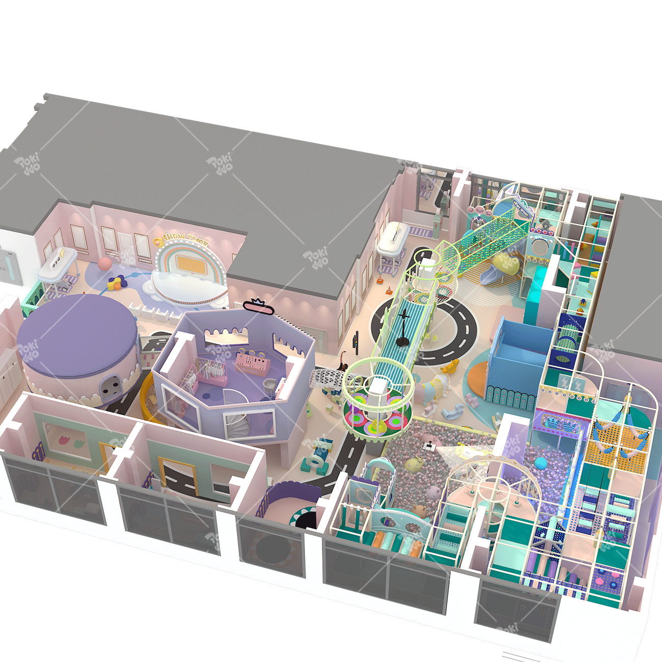 2. Mint green accents the climbing/ball pit areas (balancing visual softness and vitality);